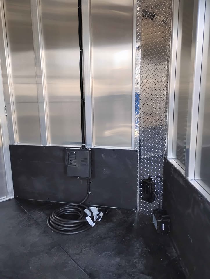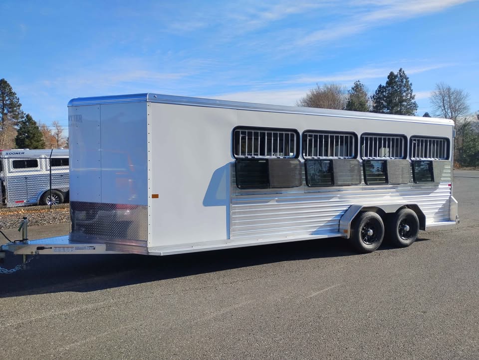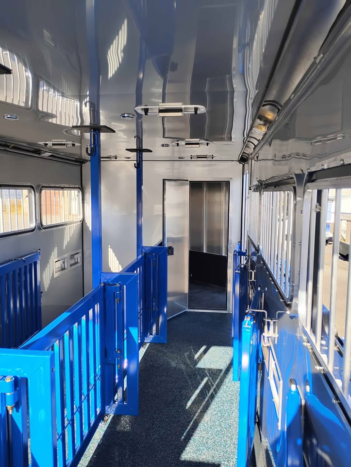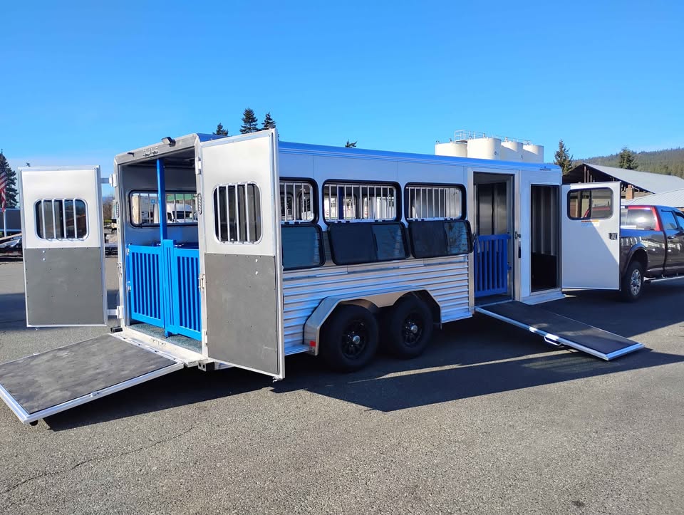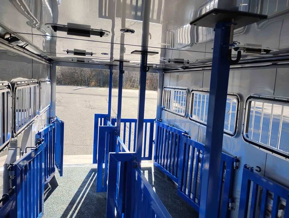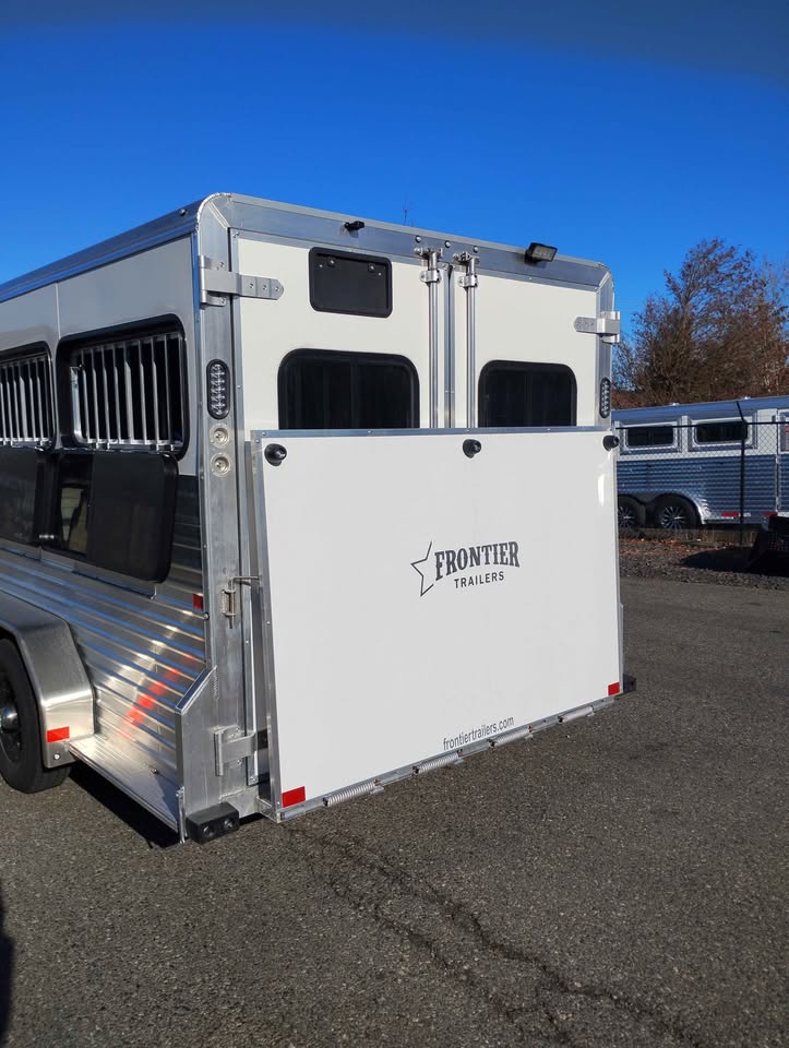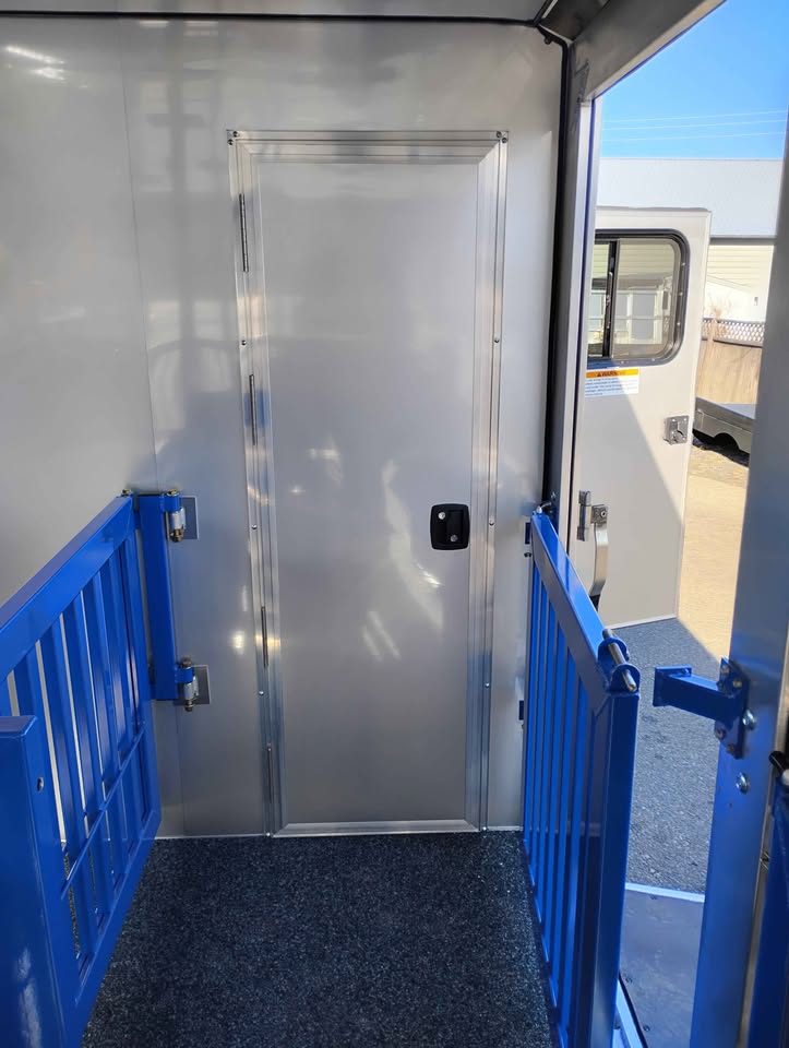 New Frontier 8 pen ready to go! If you need it delivered, don’t hesitate to ask! The interior is 75in tall x 7ft wide. 36in side ramp door, powder coated pens that are fully removable and go 50/50 or 60/40. Rated for 10k, all aluminum construction, fully insulated, lots of lights! 110v power package with a shoe cord. Stub wire for future AC ready. Exterior light package, fully drop down windows and air gaps, tack room has ample bucket hangers. Hoof Grip flooring too!