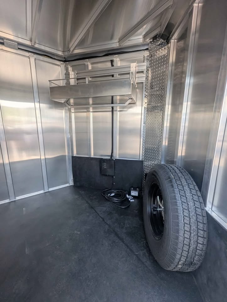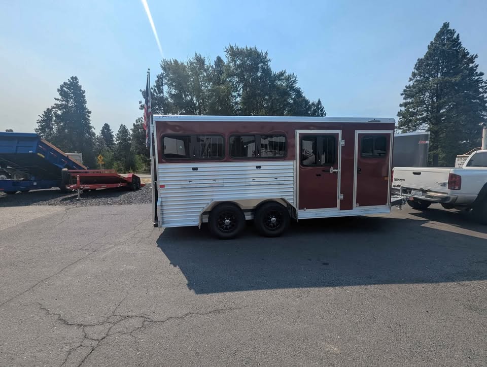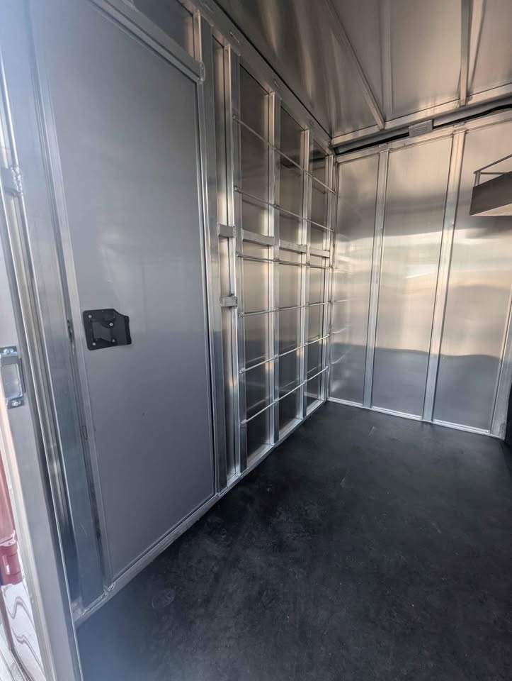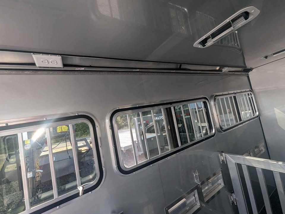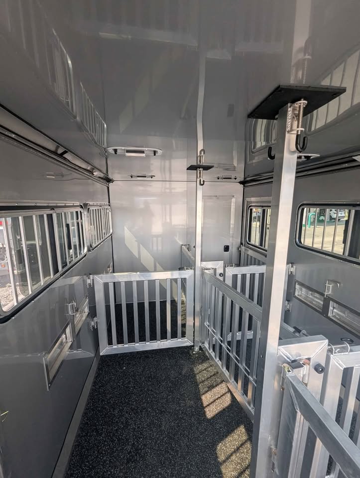 New Frontier 6-pin Livestock trailer. Interior height is 72 in and it’s 7 ft wide with all aluminum construction. 15-in black aluminum wheels with mounted spare and GVWR 7000lbs. 110 volt power package with 60 amp breaker. Stub wire installed for AC unit and 25-ft short cord. Half hat shelf in tack and bucket hangers. This trailer has additional load lights and an extended tongue for mounting a generator. We installed a hoof grip floor system and the pens are 50/50 or 60/40 composition. Delivery available Nationwide.