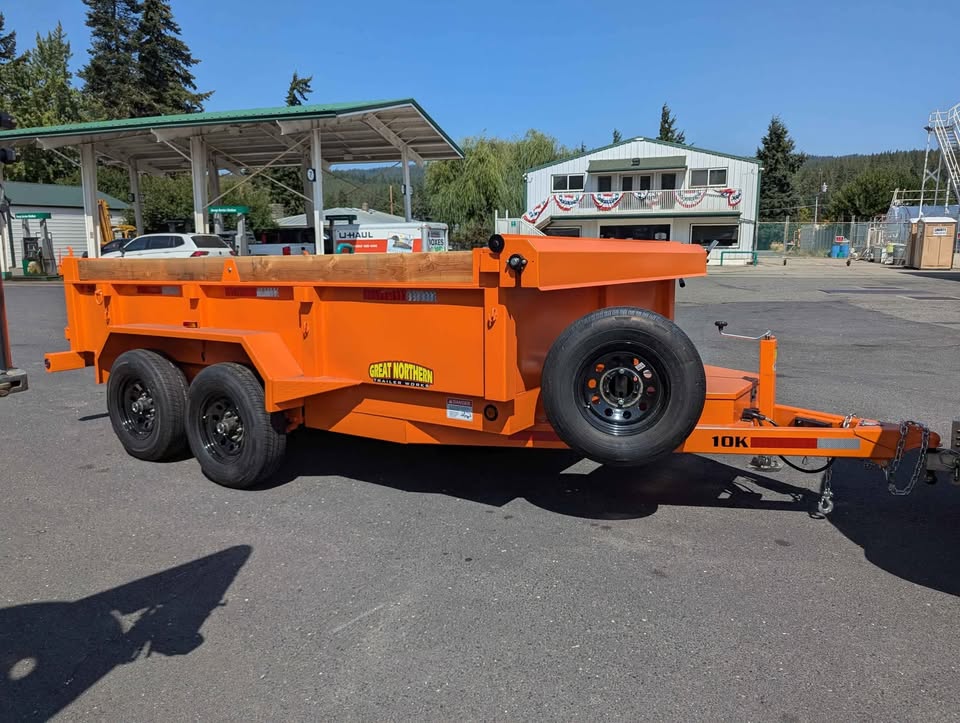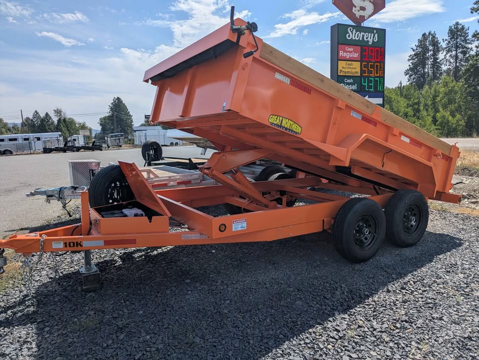 New 12ft 10k Great Northern Dump Trailer. 1 piece bottom, LED lights, radial tires, 2.5ft sidewalls, tarping system, solar charger and spare tire.